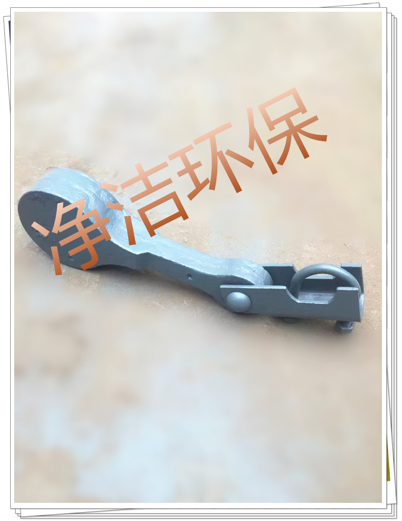 振打锤包括挠型夹紧臂、锤头、锤柄和振打轴,其特征在于所述挠型夹紧臂分为*臂、圆弧形挠曲臂和*臂,该挠型夹紧臂的*臂和锤头通过大铆钉连接,挠型夹紧臂的*臂和锤柄通过小铆钉可动地连接,锤柄固定到振打轴.采用300T冲床冲压而成的夹板能保证振打锤头的安装精度,从而不易发生锤头和振打砧打偏现象。所有边缘全部经过冼床切削,其平整度和精度远非一般小加工厂产品可以比拟。锤头与插销的间隙我们控制在1mm以内,在保证转动灵活的同时也保证锤头在打击时不会偏离振打砧。